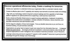 The document discusses how aligning business and IT strategies across all levels of an organization's enterprise architecture can produce cost savings. It presents diagrams illustrating how business and IT strategies can flow through and align the different levels, from enterprise infrastructure to applications. Operational maturity is correlated with savings opportunities. A methodology is described for measuring current maturity levels, identifying savings potential, and improving processes to deliver savings of over 20% by focusing activities on business goals and strategies. Examples are given of cost reductions achieved through this approach on past projects.