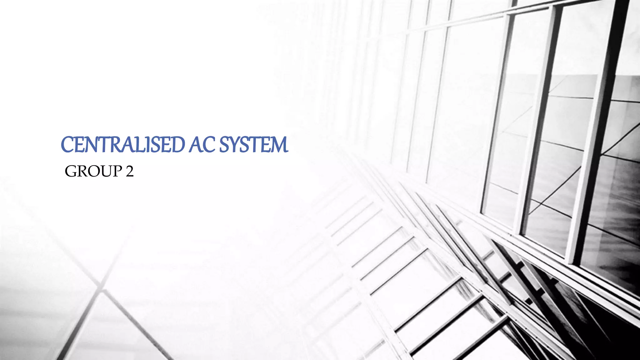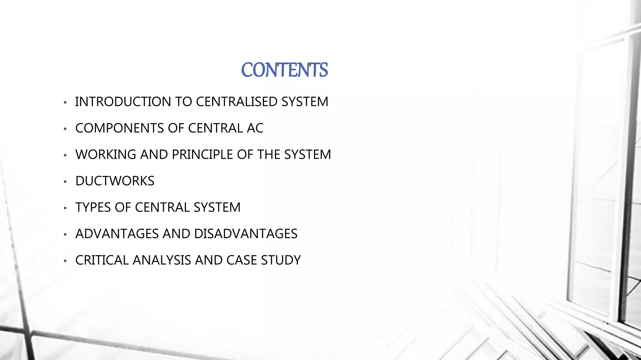 The document provides a comprehensive overview of centralized air conditioning systems, including their components, working principles, and types like split and packaged units. It outlines the refrigeration cycle, ductwork functions, and essential parts such as the air handling unit, compressor, and thermostat. It also discusses advantages and disadvantages, highlighting aspects like energy efficiency and maintenance requirements.
