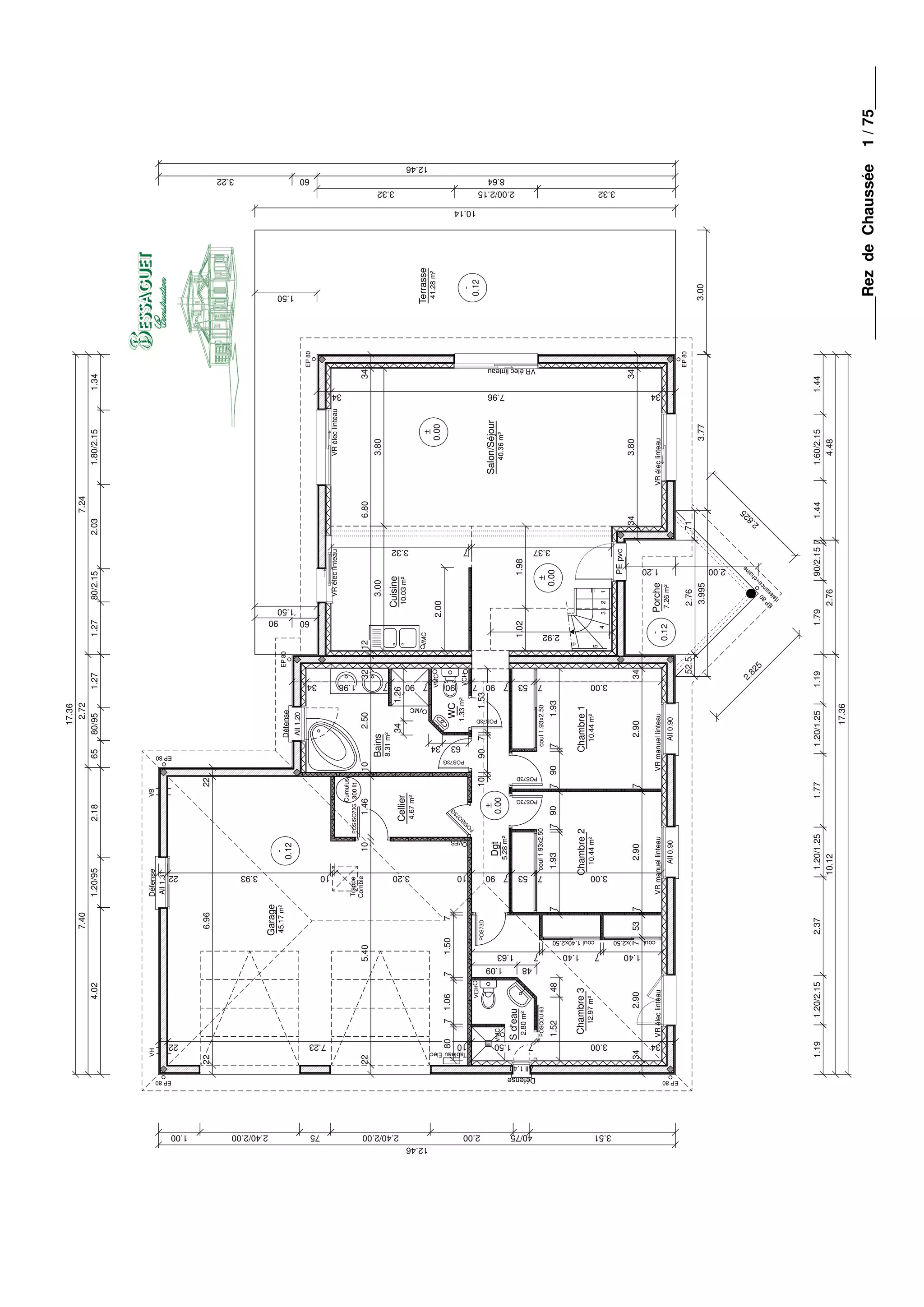 This document appears to be a technical drawing or blueprint for a building project. It includes measurements and specifications for various rooms, materials, HVAC systems and other building components. Abbreviations are used throughout for items like ventilation systems, electrical panels, doors and windows. The document also provides total areas for rooms like the living room, kitchen, garage, bedrooms and bathrooms.