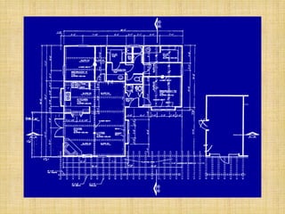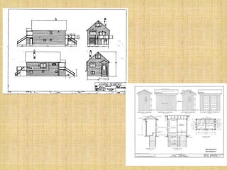 Architectural drawings are technical drawings used by architects to develop and communicate building design ideas. They include various standard views like floor plans, sections, elevations, and site plans. Floor plans show the arrangement of a building level and include furniture and fixtures. Site plans show the building footprint and surrounding context. Elevations display the front or sides of a building. Sections cut through a building to reveal interior details. Architectural drawings are scaled and use conventions for accurate representation and understanding of designs.