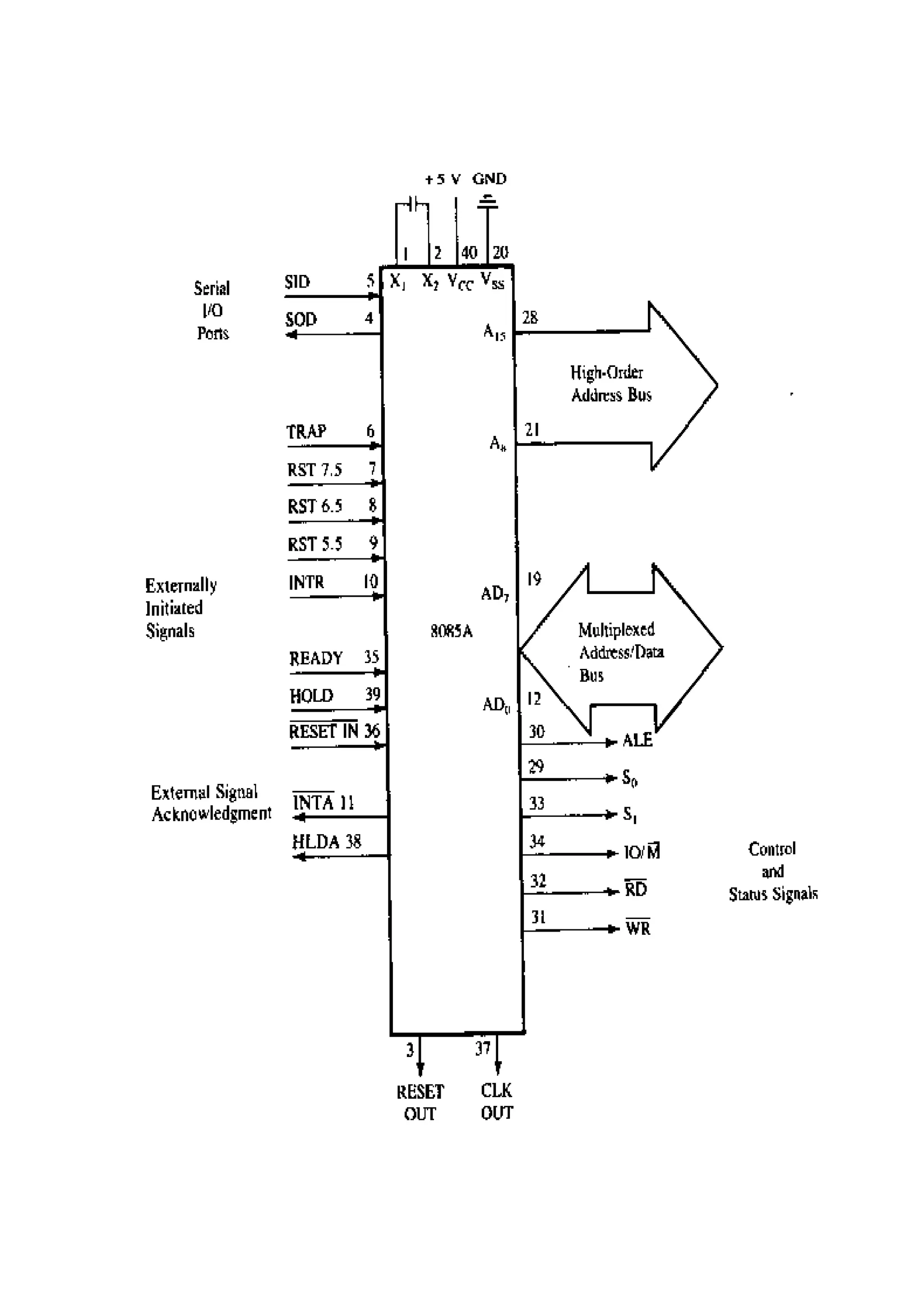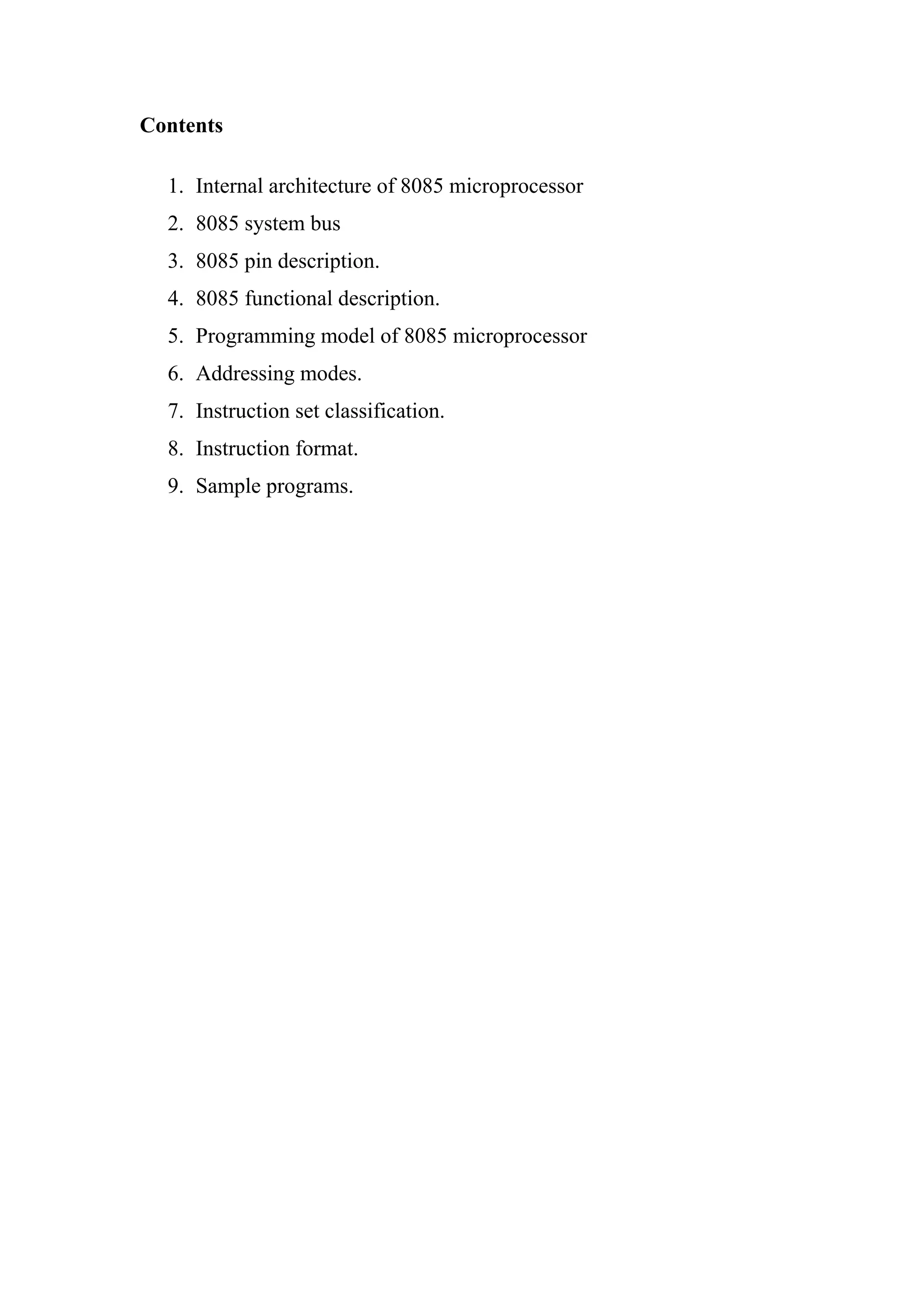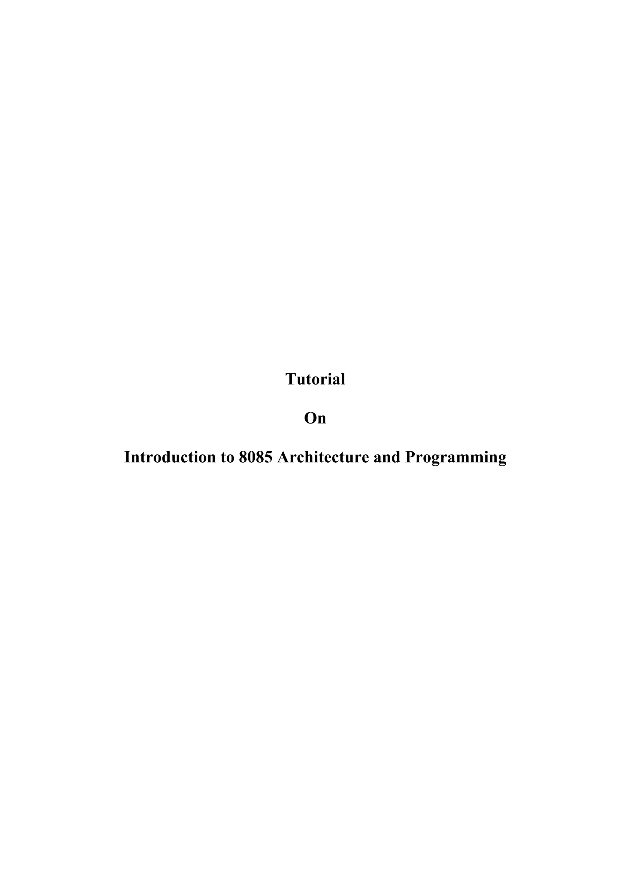 This document provides an overview of the internal architecture and programming of the 8085 microprocessor. It describes the main components of the 8085 including the control unit, arithmetic logic unit, registers, flags, program counter, stack pointer, and buses. It also covers the 8085 pin descriptions and functional details. The document is intended as a tutorial on understanding the 8085 architecture and programming model.