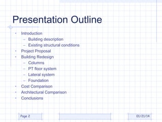The document outlines a thesis presentation on the redesign of Best Buy's corporate building in Richfield, MN, focusing on structural engineering aspects. It details the existing structural conditions, proposed redesign features using a full concrete system, and cost comparisons between the old and new architecture. Additionally, the conclusions emphasize the benefits of increased bay sizes, but highlight that the new system incurs significantly higher costs.
