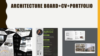 The document provides tips for effectively structuring and designing architecture presentation boards. It recommends: