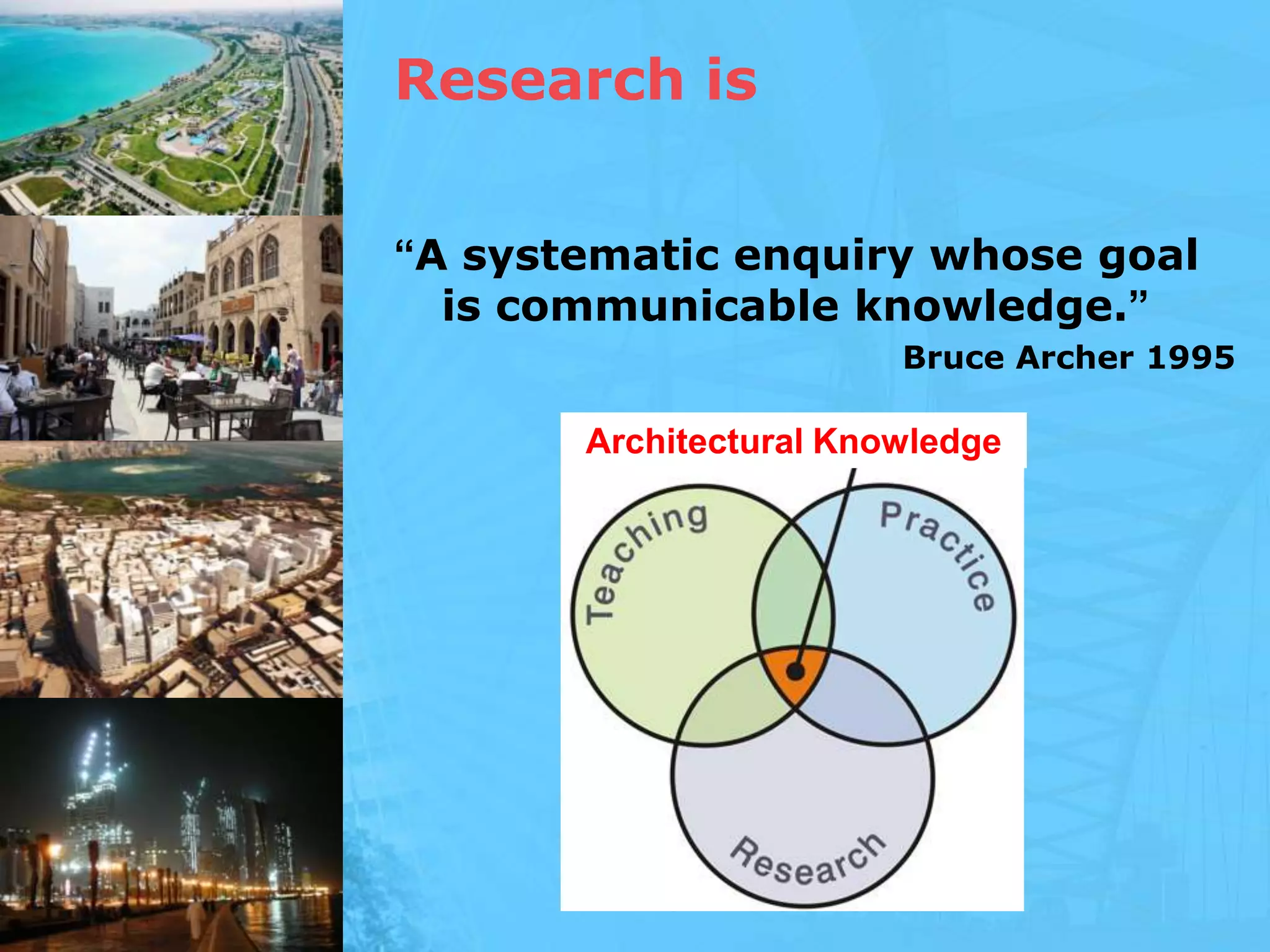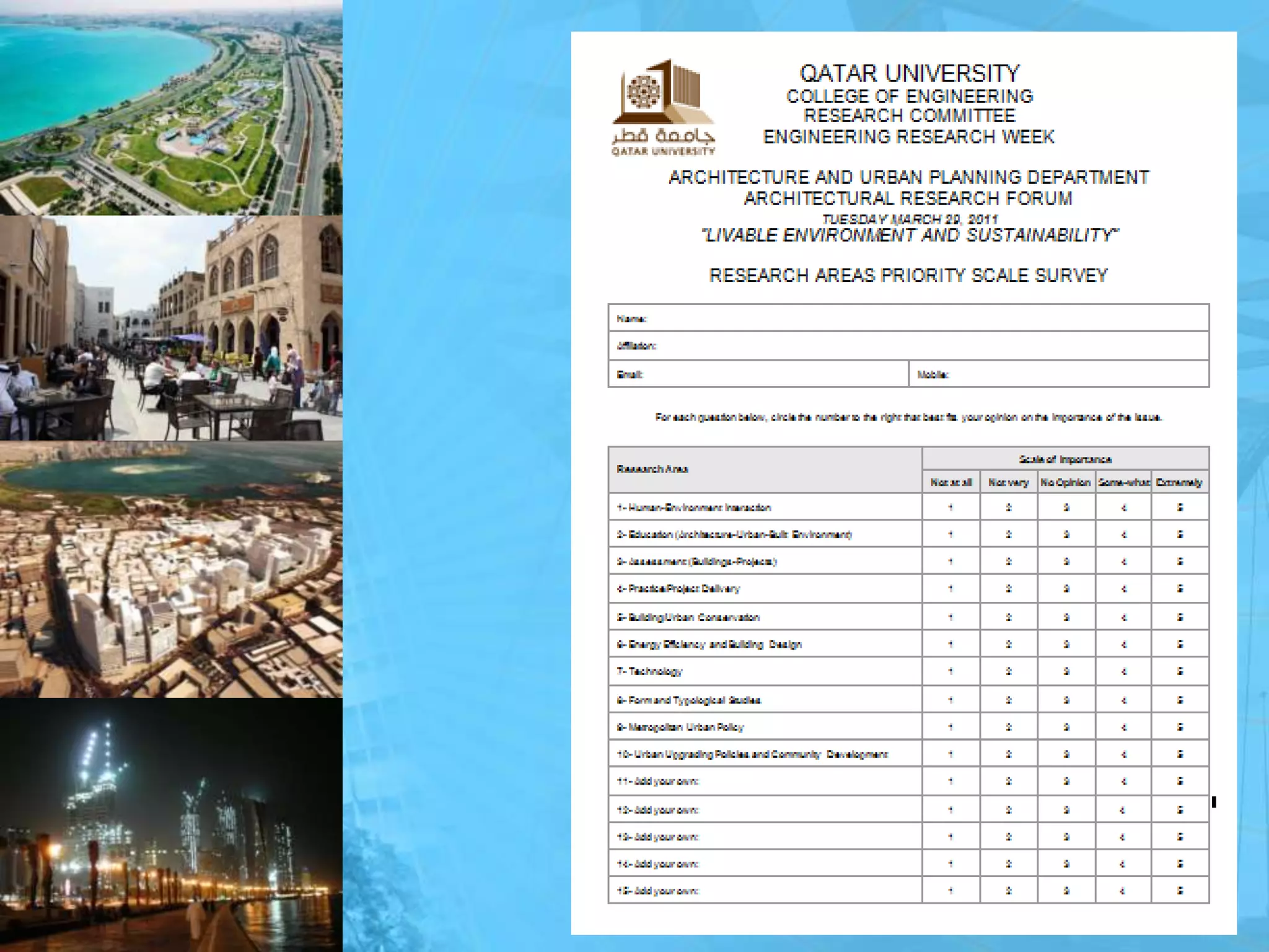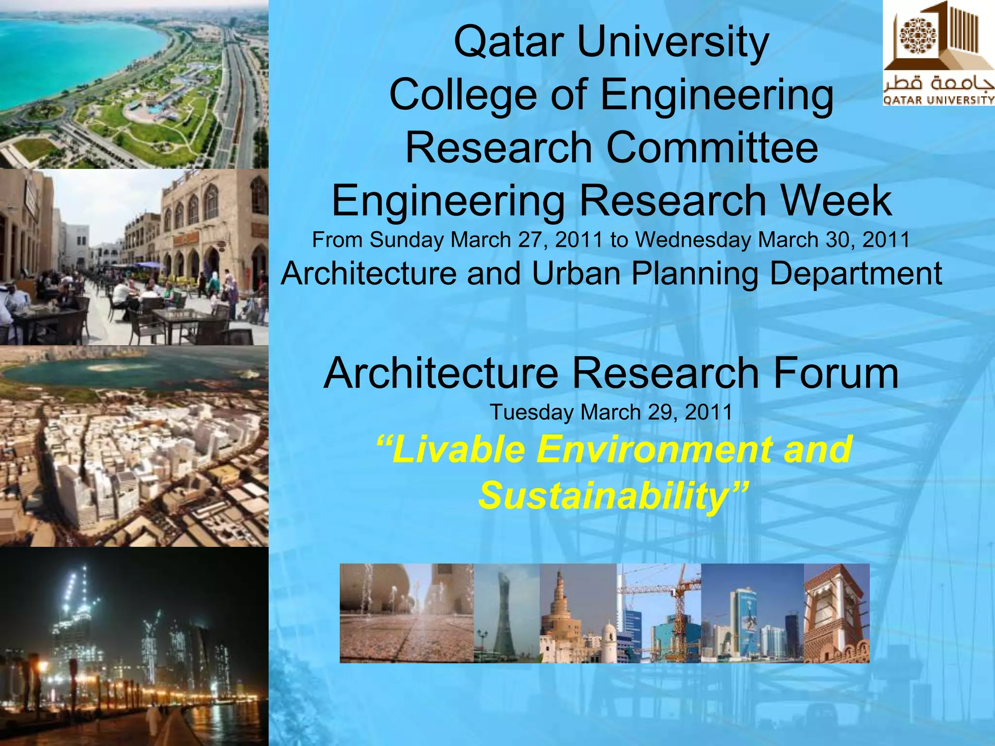 This document summarizes an engineering research workshop at Qatar University on "Livable Environment and Sustainability". The workshop will highlight current research projects in architecture and urban planning, discuss how architectural research benefits the community and industry, and identify priority research areas and topics for Qatar. The agenda includes invited speakers, panel discussions on how research impacts different groups, and a workshop to revise Qatar's priority research areas and generate new proposals. The document also outlines the university's research theme of "Sustainable and Livable Environments" and 10 specific research areas.