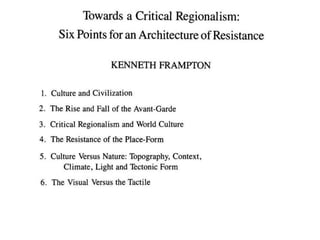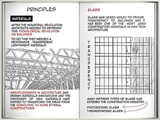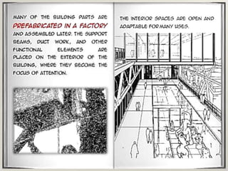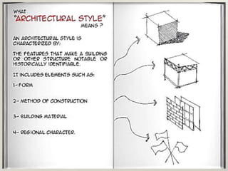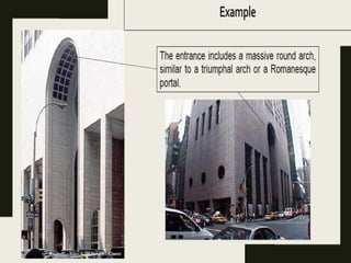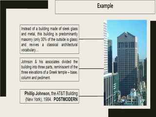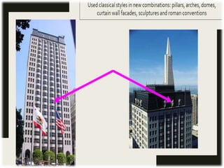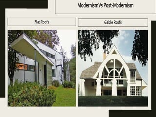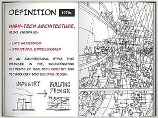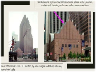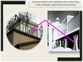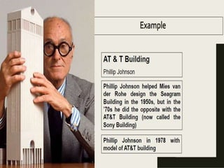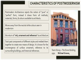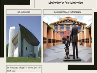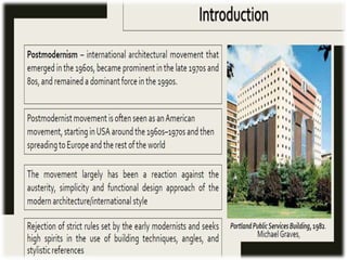 Modernism arose in the late 19th century as a philosophical movement in response to industrialization. Notable modernist architects included Mies van der Rohe, Le Corbusier, and Frank Lloyd Wright. Modern architecture developed new building materials and techniques. Styles included the Chicago School, Expressionism, the International Style, and Brutalism. Postmodernism emerged in the 1970s as a reaction against modernism. Deconstructivism from the 1980s fragmented and layered forms. Folding architecture from the 1990s integrated differences through smooth layering inspired by geology and cooking.