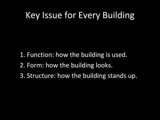 The document discusses the key concepts of architecture including function, form, and structure. It explains how buildings stand up through different structural systems like post and beam, arches, vaults, domes, and buttresses. Different examples are provided to illustrate each structural type. The document also covers forces that structures must withstand like compression, tension, and bending. Additionally, it discusses how materials like stone, concrete, cast iron, and steel have been innovatively used in architecture over time.