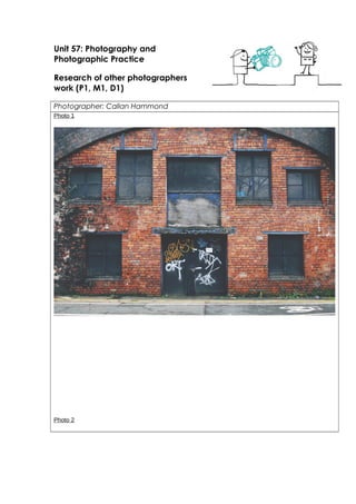 Callan Hammond took four photographs around Manchester and Blackpool. The document analyzes each photo individually. Photo 1 shows the reflection of trees in a brick building's windows. Photo 2 was taken on a sunny day in Blackpool and has good depth of field. Photo 3 is a colorful metal staircase in Manchester with incredible depth and bright colors. Photo 4 features a mysterious figure in an archway of an old building and has a black and white filter. Overall, the photographer effectively applied the rule of thirds in composing shots with central focal points.
