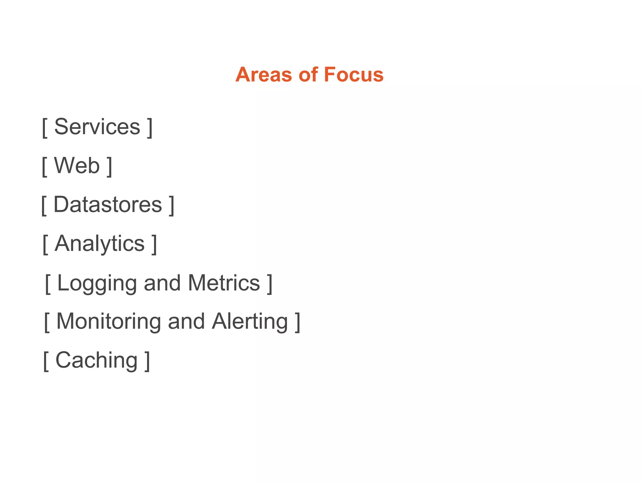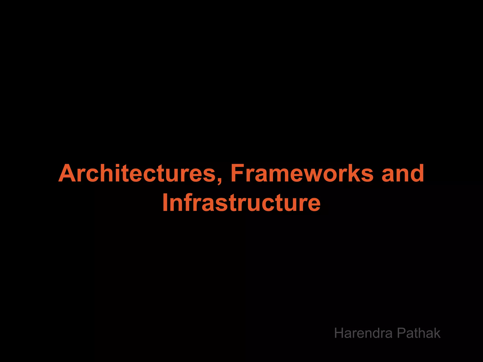 This document discusses various technologies related to architectures, frameworks, infrastructure, services, data stores, analytics, logging and metrics. It covers Java 8 features like lambda expressions and method references. It also discusses microservices, Spring Boot basics and features, Gradle vs Maven, Swagger, AngularJS, Gulp, Jasmine, Karma, Nginx, CloudFront, Couchbase, Lambda Architecture, logging with Fluentd and Elasticsearch, metrics collection with Collectd and Statsd, and visualization with Graphite and Grafana.