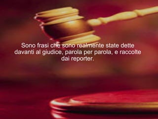 Il documento raccoglie battute esilaranti e surreali pronunciate durante processi giudiziari, evidenziando scambi tra avvocati e testimoni. Le domande e risposte mostrano situazioni imbarazzanti e risposte imprevedibili che mettono in luce l'assurdità di alcuni momenti in aula. Il testo, tratto dal libro "Disorder in the Court", offre un'interpretazione comica delle dinamiche legali.