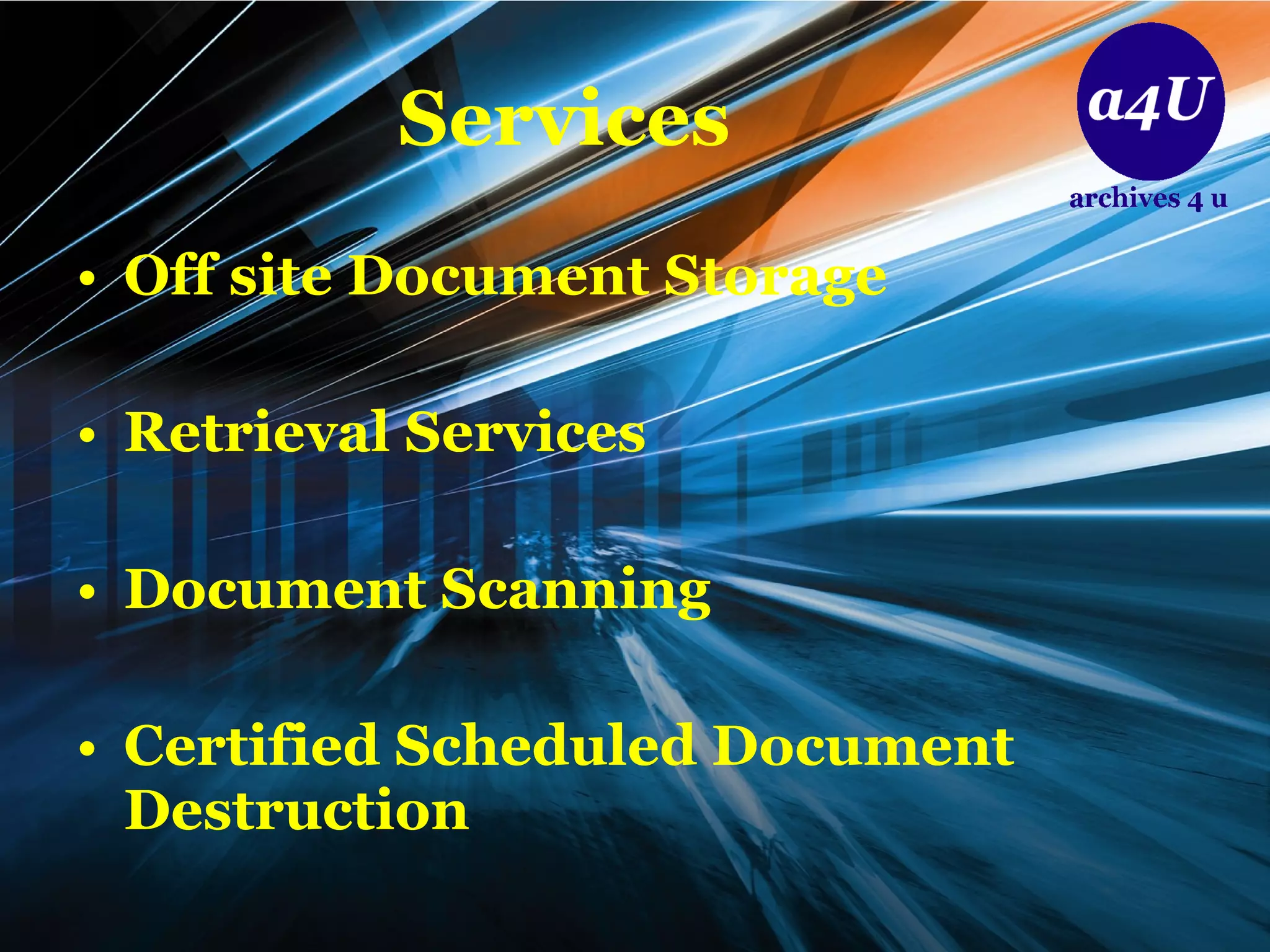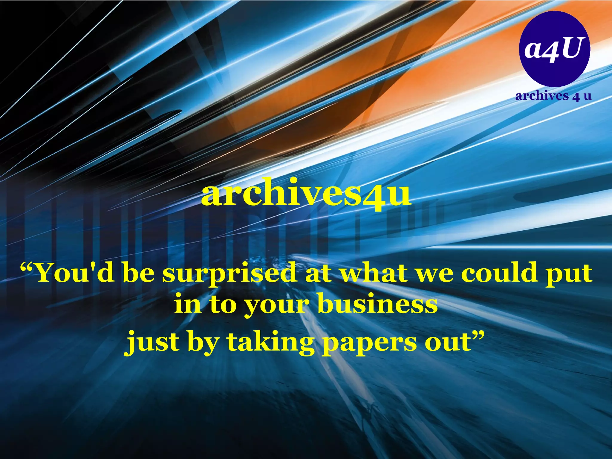 Archives4u provides off-site document storage and retrieval services, document scanning, and certified document destruction to help businesses maximize their office space and improve document security. Their services include safe and secure off-site storage with same or next day retrieval, barcode tracking of cartons and files, online document management and retrieval requests, scanning documents to PDF, and certificated destruction of documents in accordance with data protection laws.