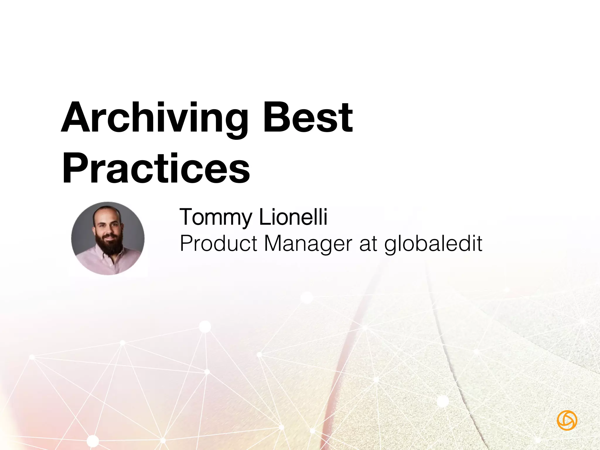 The document outlines archiving best practices for creative professionals, emphasizing the importance of long-term access, organization, and risk management in content storage. It provides reasons for archiving, including scalability and legal compliance, and presents strategic and technical questions to consider when implementing an archiving process. Best practices include establishing a business case, creating a standardized folder structure, and ensuring proper metadata management.