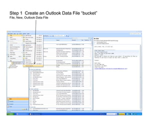The document provides a step-by-step guide for creating and managing Outlook data files (.pst). It includes instructions for naming, organizing, and moving emails into folders within the personal folder structure. Additionally, it emphasizes the importance of backing up these files and offers tips for efficient management.