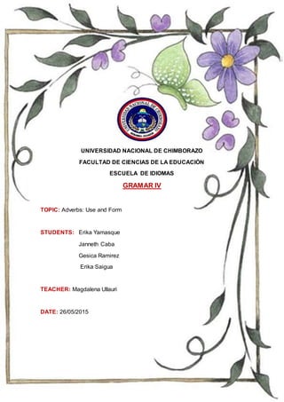 This document provides information about adverbs including their definition, use, form and types. It discusses how adverbs modify verbs, adjectives and other adverbs to express manner, place, time or degree. It distinguishes between adjectives and adverbs and provides examples of each. The document also describes different types of adverbs such as adverbs of time, place, degree, manner and frequency. It discusses adverbial phrases and prepositional phrases. Finally, it covers how most adverbs are formed by adding -ly to adjectives and lists some irregular adverb forms.