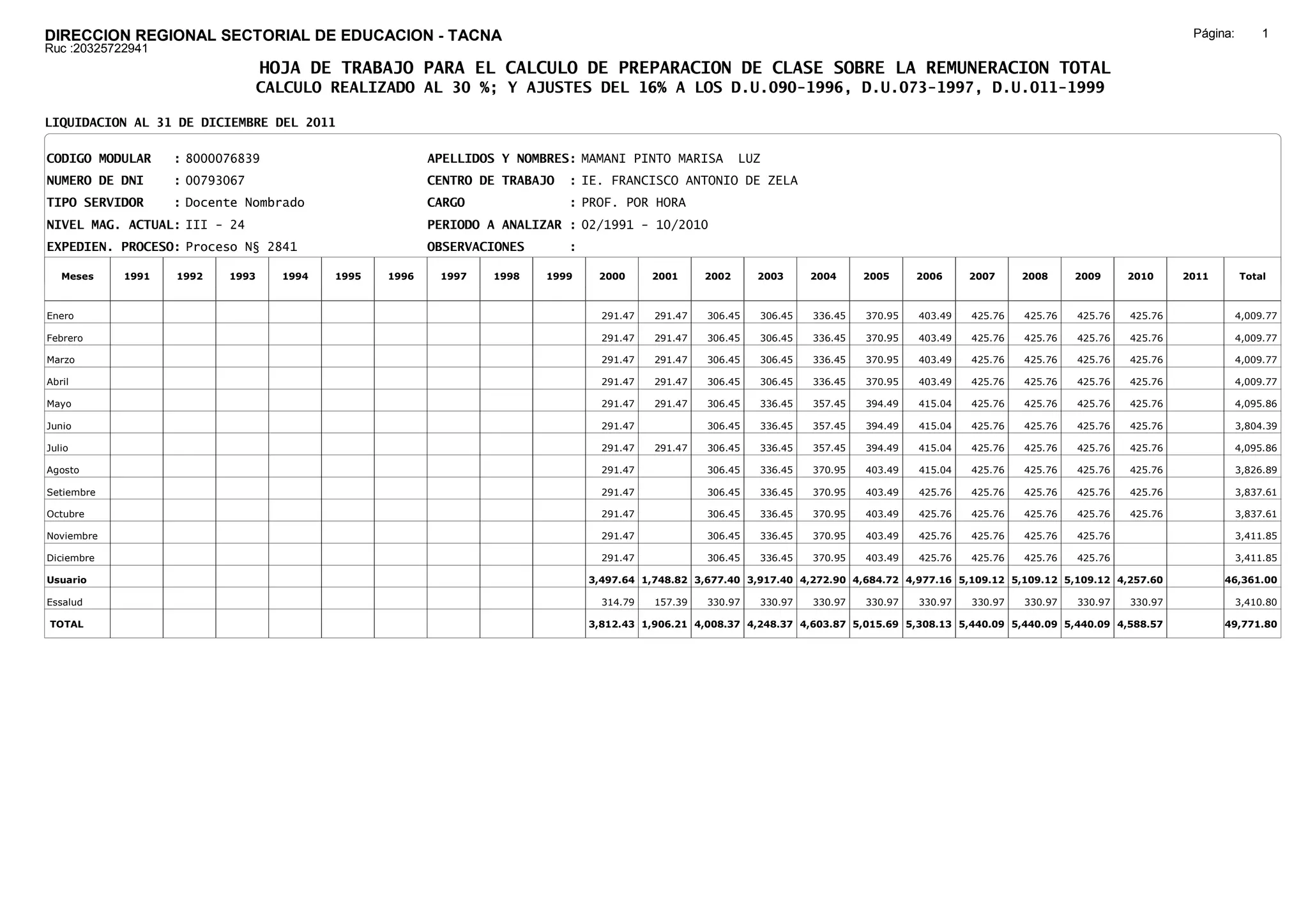 CODIGO MODULAR : 8000076839 APELLIDOS Y NOMBRES: MAMANI PINTO MARISA LUZ
