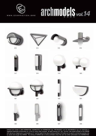 The document advertises Archmodels Volume 14 from Evermotion, which contains over 100 professional 3D models of highly detailed architectural objects and external lamps to help architects work more quickly and precisely with their visualizations. The collection is copyrighted and intended solely for commercial use by those who purchased the CD-ROM, and sharing or reselling the models is prohibited without permission.