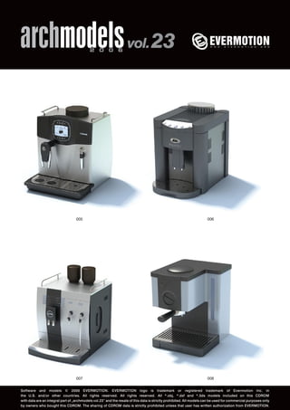 The document describes Archmodels Volume 23, which is a CD that provides 100 professional architectural models for architectural visualizations. It is produced by Evermotion to help architects work more efficiently on modeling and rendering projects while maintaining high precision. The CD contains common objects that would be found in modern homes.