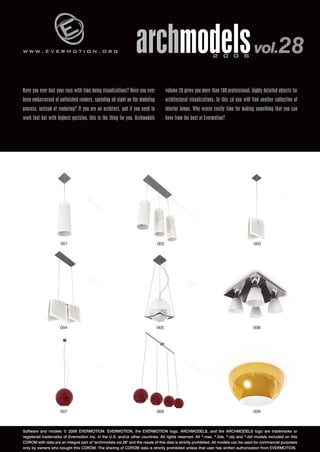 This document describes the contents of the CD-ROM "archmodels vol.28" produced by Evermotion. It contains over 100 professional 3D models of architectural elements and interior objects for architects to use in their design visualization work. The models allow architects to work faster and with greater precision than modeling everything from scratch. The CD also includes interior lamps to use in architectural renderings. Purchase of the CD gives single-user licenses for the models for commercial use in architectural projects.