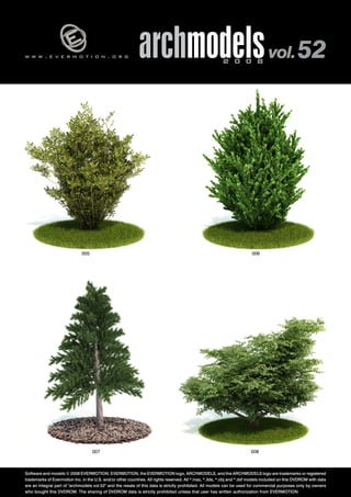 Archmodels Volume 52 is a collection of 60 professional 3D models of plants and objects for architectural visualization. It is produced by Evermotion to help architects work faster and with great precision on visualization projects. The collection provides highly detailed models that can save time compared to modeling objects from scratch. Usage of the models is governed by licensing terms that require ownership of the DVD containing the assets.