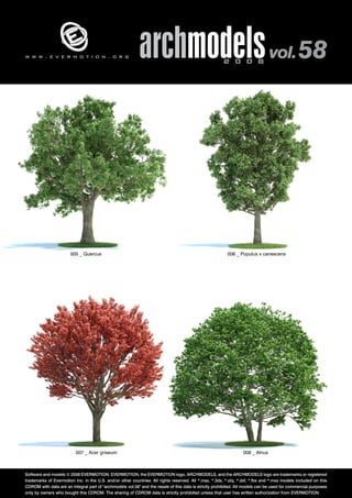 This document provides a summary of Archmodels Volume 58 by Evermotion. It contains 60 highly detailed 3D models of plants and trees suitable for architectural visualization. The models include various trees like oak, elm, birch, pine, and spruce that can be used to enhance renders and save time that would otherwise be spent modeling plants from scratch. Purchase of the CDROM is required for commercial use of the models and data sharing is prohibited without permission.