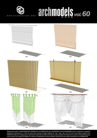 Archmodels volume 60 is a DVD that provides over 70 professional, highly detailed objects for architectural visualizations. It contains a collection of hangings that can save architects time that would otherwise be spent modeling objects themselves. The DVD and models can only be used for commercial purposes by those who purchase the DVD, and sharing or reselling the data is prohibited without permission.