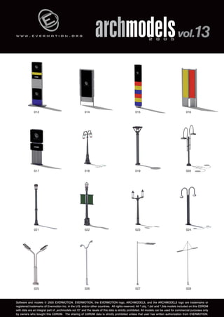 This document describes Archmodels Volume 13, which is a collection of 3D models produced by Evermotion containing over 100 objects commonly found in architectural visualizations, such as street lamps, benches, and telephone booths. It is intended for architects who need to work quickly but with high precision on their modeling projects and renders. The collection allows them to avoid wasting time designing common objects that are included in the package.