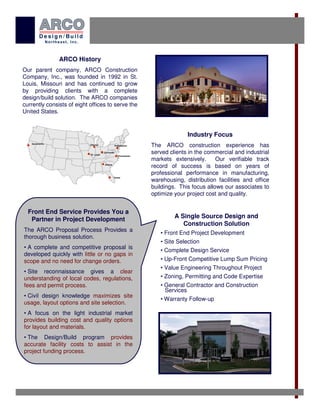 ARCO Construction Company was founded in 1992 in St. Louis, Missouri and has since expanded to eight offices across the United States, specializing in commercial and industrial construction projects including manufacturing facilities, warehouses, and office buildings. ARCO prides itself on its design/build approach which provides clients with a single point of contact and saves on costs and schedule compared to traditional methods. The document highlights several past projects for clients across various industries to demonstrate ARCO's capabilities and experience.