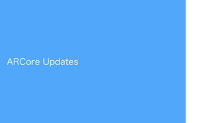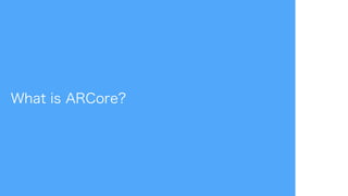 The document provides information about Google's ARCore platform for augmented reality development. It discusses what ARCore is, how it works for motion tracking, environmental understanding, and light estimation. The document also provides release notes and details on how to use ARCore with Android apps through APIs like ArFragment and ModelRenderable, as well as supported devices for ARCore. WebXR capabilities with ARCore are also summarized, including how to implement hit testing using the requestHitTest method.