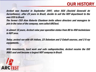 This document discusses the history and development of computed radiography (CR) by ARCTEST, a Brazilian company specializing in non-destructive testing. It outlines how ARCTEST has been a pioneer in developing and improving CR techniques over the past 14+ years, working with various equipment manufacturers to test new systems. The document highlights the advantages of CR over traditional radiography for corrosion inspection and weld inspection, noting that CR provides faster results, less radiation exposure, and digital image archiving and reporting. It presents examples of CR applications for inspection of welds, corrosion, and other defects in various industrial components.