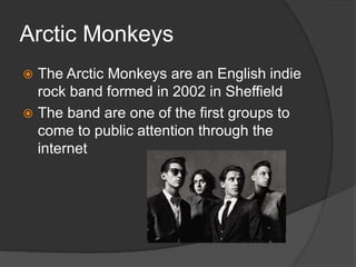 The Arctic Monkeys are an English indie rock band formed in 2002 in Sheffield. They were one of the first bands to gain attention through the internet. Their musical style has evolved across albums from garage rock to desert rock to a mixture of styles. Band members include lead vocalist and guitarist Alex Turner, guitarist Jamie Cook, bassist Nick O'Malley, and drummer Matt Helders. The band has released five studio albums and achieved significant commercial and critical success, including the fastest selling debut album in British history.