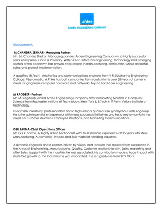 Ardee Engineering Company, established in 2008, specializes in turnkey electro-mechanical and civil solutions in sectors like ports, power, and manufacturing. The company aims for operational excellence through a dedicated professional team and has executed numerous major projects, including pre-engineered buildings and gantry cranes. With a workshop in Hyderabad and advanced machinery, they maintain high standards in quality and customer satisfaction, backed by a management team with extensive industry experience.