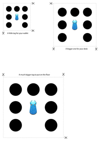 This document describes three different sized tags - a small tag for wallets, a medium sized tag for desks, and a large tag meant to be placed on the floor.