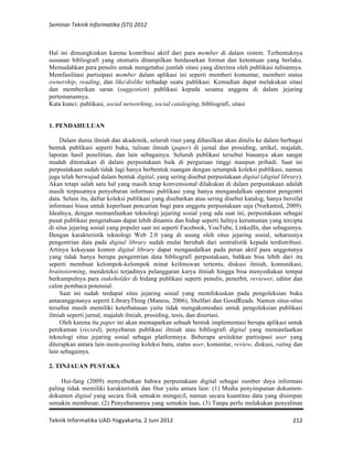 Penelitian ini menghasilkan aplikasi bibliografi digital berbasis social cataloging untuk mengelola publikasi akademik, memungkinkan kolaborasi antar anggota perpustakaan. Sistem ini memfasilitasi kontribusi anggota dalam pengumpulan data publikasi dengan fitur tagging dan pengelolaan sitasi. Dengan memanfaatkan teknologi distribusi, aplikasi ini meningkatkan partisipasi pengguna dalam aktivitas perpustakaan digital secara dinamis.