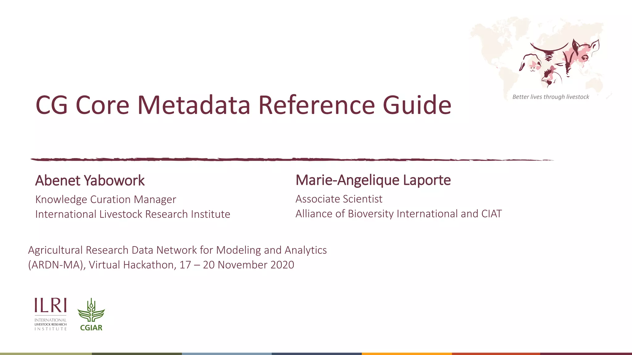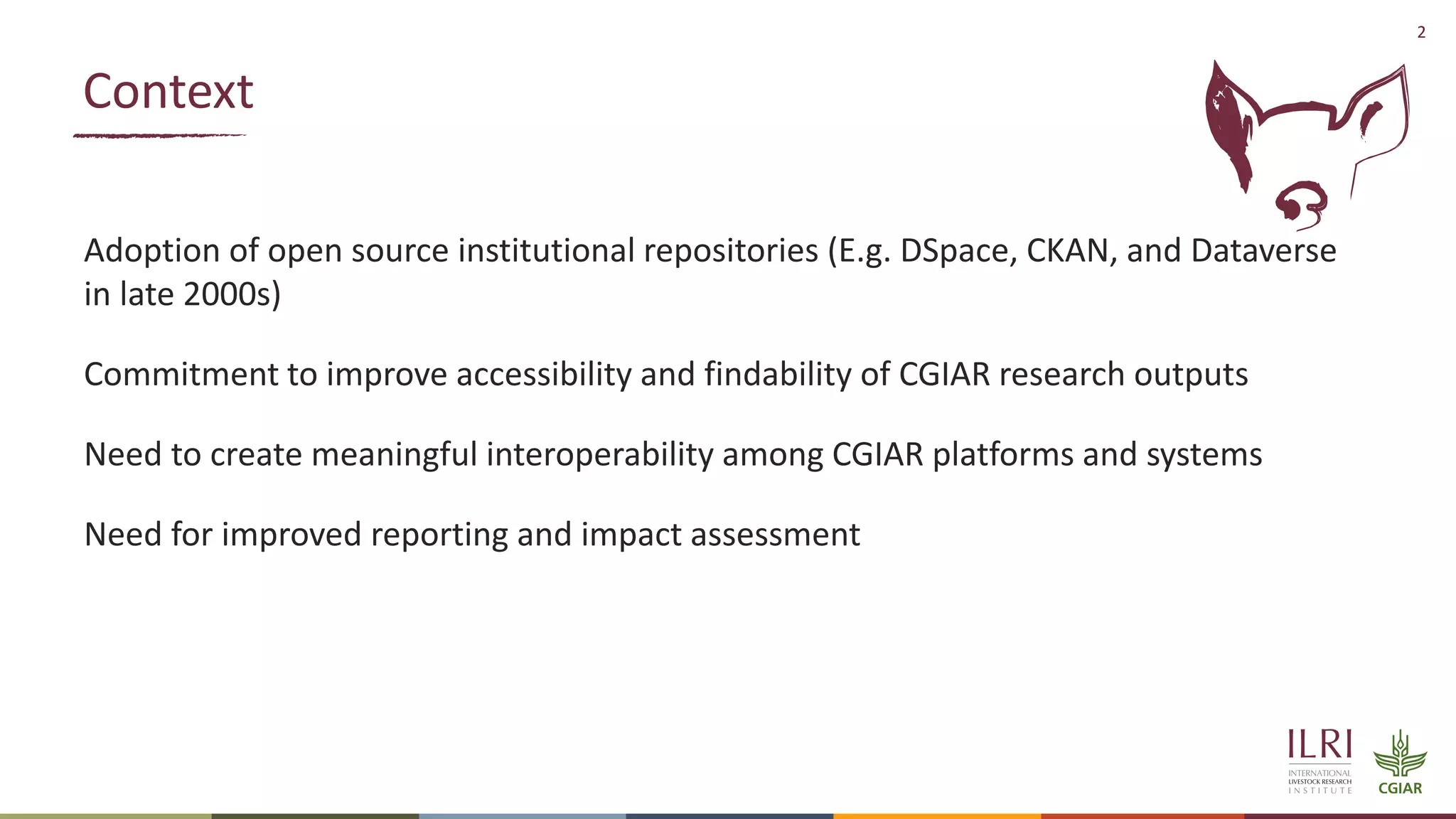 The document outlines the development of the CG Core metadata reference guide aimed at improving the accessibility, findability, interoperability, and reusability of CGIAR research outputs. It discusses the transition from CG Core version 1 to version 2, which aligns with the Dublin Core schema and provides standardized metadata guidelines. Additionally, it highlights the significance of CG Core in fostering innovations such as the GARDIAN fairification workflow and CGSpace Explorer.