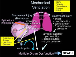 3) Mechanical ventilation is used to treat respiratory failure but can further damage the lungs if not done carefully. The ARDSNet trial showed using low tidal volumes of 6 ml/kg improved survival compared to larger volumes.