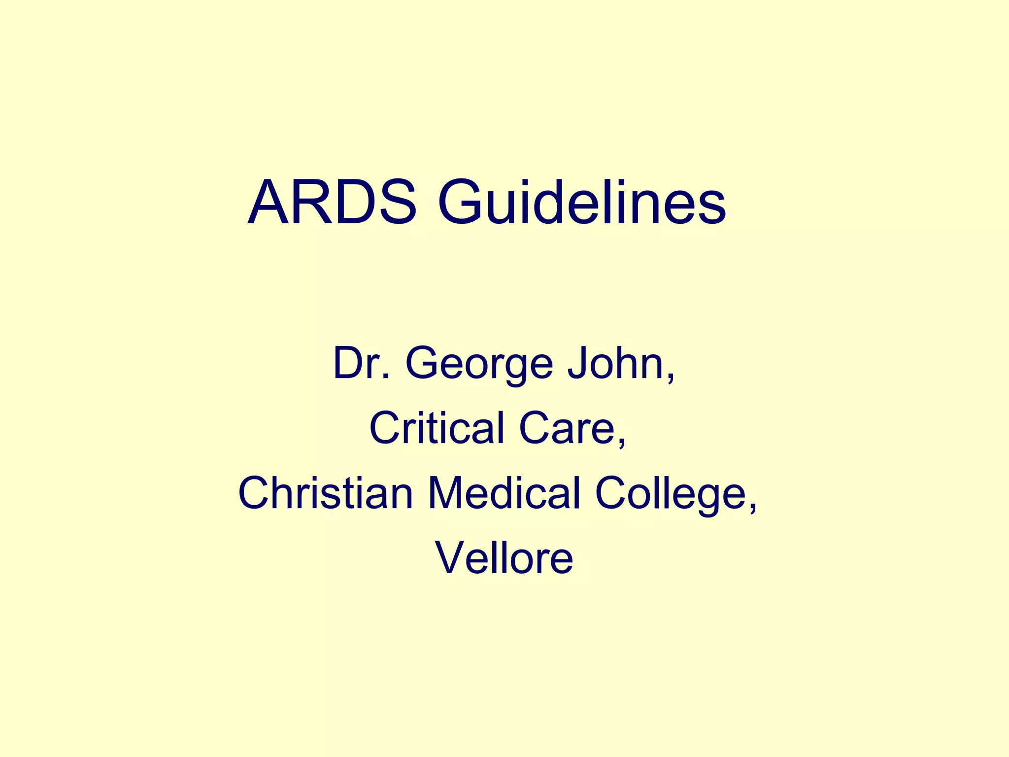 The document provides guidelines for the treatment of Acute Respiratory Distress Syndrome (ARDS). It discusses factors that cause ARDS and the spectrum of lung injury. Treatment guidelines cover oxygenation, ventilation, positioning, fluid management, and other modalities. Oxygenation goals aim to optimize oxygen levels while minimizing pressure and volume. Ventilation aims for low tidal volumes and pressures. Prone positioning may reduce mortality but did not consistently improve outcomes in studies. Conservative fluid management improved some outcomes compared to liberal management with no increase in complications.