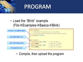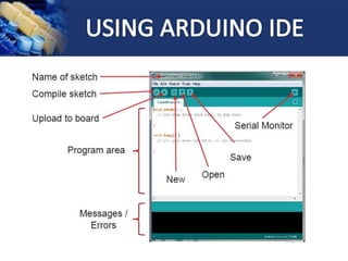 This document provides an overview of microcontrollers and the Arduino platform. It discusses what a microcontroller is and some common types. It then introduces Arduino as an open-source prototyping platform using easy hardware and software. Several Arduino boards are described and the ATmega328p microcontroller chip is specified. The document outlines how to download the Arduino software and write programs. It provides examples of basic Arduino projects like blinking LEDs, reading sensors, and creating sounds.