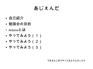 自己紹介 ● 勉強会の目的 ● Arduinoとは ● やってみよう(1) ● やってみよう(2) ● やってみよう(3) できるとこまでやってみようスタンスで