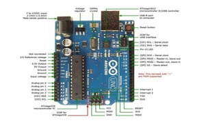 3) It has digital and analog pins that can be configured as inputs or outputs to interface with sensors and actuators. The analog pins can read signals from sensors like temperature and humidity sensors.