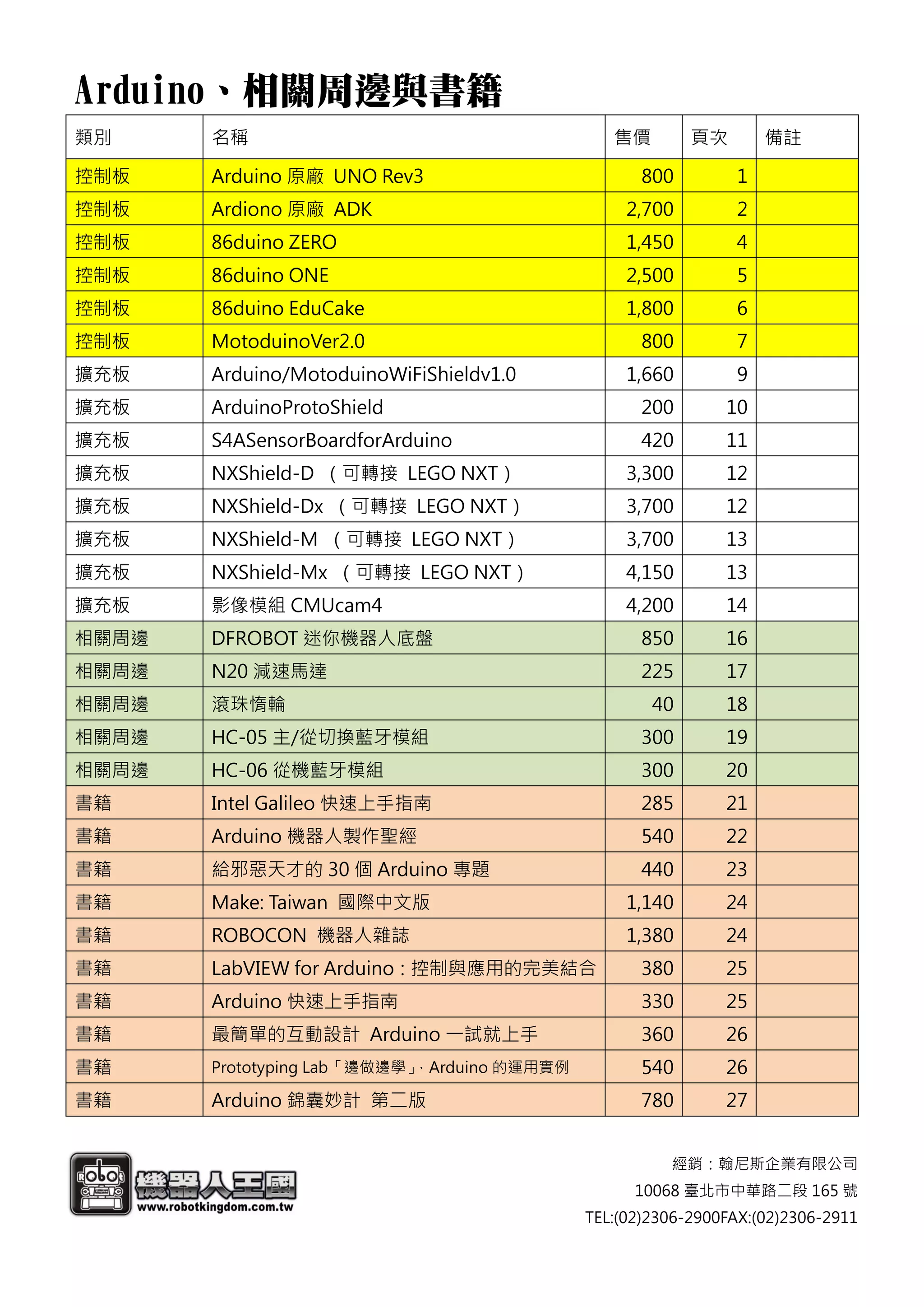 這個文檔包含了翰尼斯企業有限公司的產品資訊,主要是關於Arduino及其相關周邊設備的價格、技術規格和應用介紹。此外,文檔還詳細列出了不同型號的控制板和擴充板,包括Arduino UNO、ADK和86duino系列,並附有購買資訊和特性說明。適合學習、DIY及各種互動式科技創作的需求。