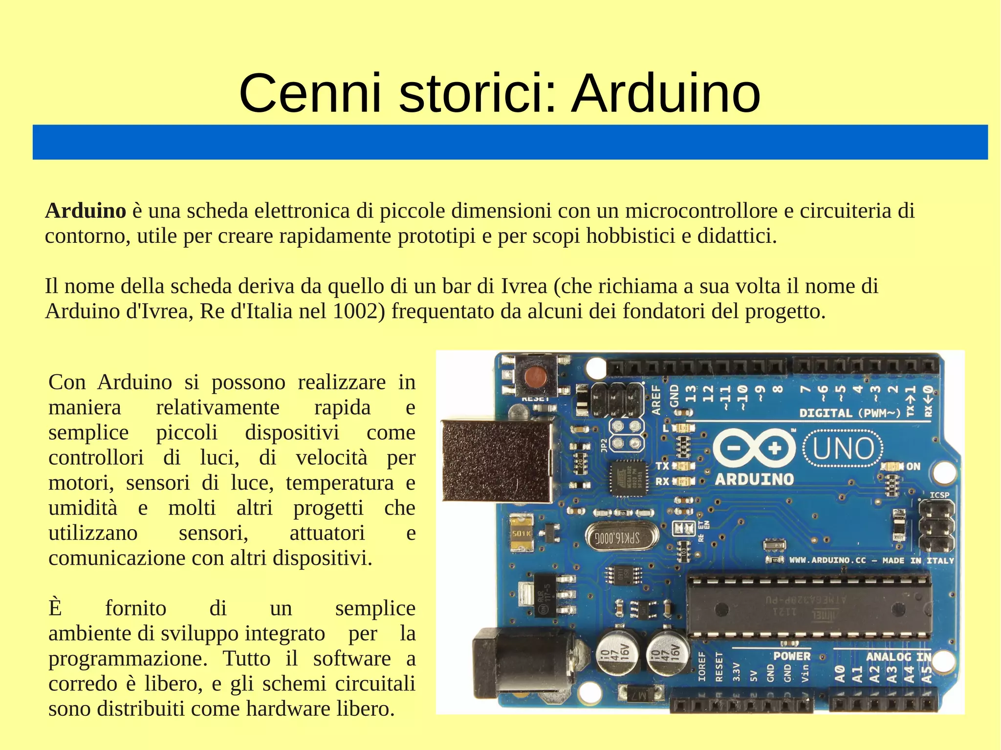 Il documento discute le schede di prototipazione elettronica, in particolare Arduino e i suoi vari modelli, evidenziando il loro utilizzo nell'automazione e nei progetti di physical computing. Viene anche menzionato Udoo, un micro-PC compatibile con Arduino, che ha avuto successo su Kickstarter, e altre piattaforme come Intel Galileo e Edison, esaminando le loro caratteristiche tecniche e i vantaggi per gli sviluppatori. Infine, si sottolinea l'importanza di queste tecnologie nel supportare la prototipazione e lo sviluppo software.
