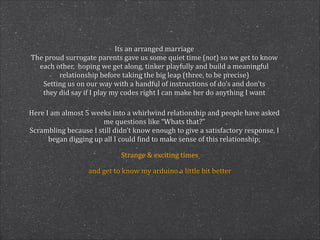 The document discusses the history and impact of the BBC Microcomputer from 1981 and the Arduino microcontroller platform launched in 2005. It describes how the BBC Micro helped spark the UK's gaming industry through its widespread availability in schools. Similarly, Arduino has enabled many students, hobbyists and startups to get involved in physical computing. Examples are given of how both platforms have been used for education, from teaching programming basics to developing assistive technologies for people with disabilities. The potential for platforms like Raspberry Pi and Arduino to continue inspiring new generations of students is also noted.