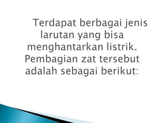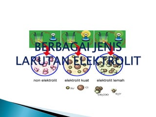 Dokumen ini membahas konsep oksidasi dan reduksi dalam reaksi kimia, serta pentingnya bilangan oksidasi dalam menentukan sifat zat. Selain itu, dijelaskan tentang larutan, jenis-jenis larutan elektrolit, dan karakteristik elektrolit kuat, lemah, serta non-elektrolit. Penjelasan juga mencakup contoh-contoh senyawa yang terkait dengan masing-masing kategori larutan.