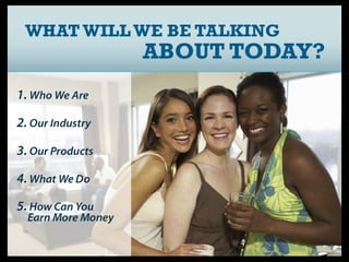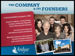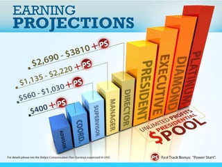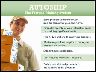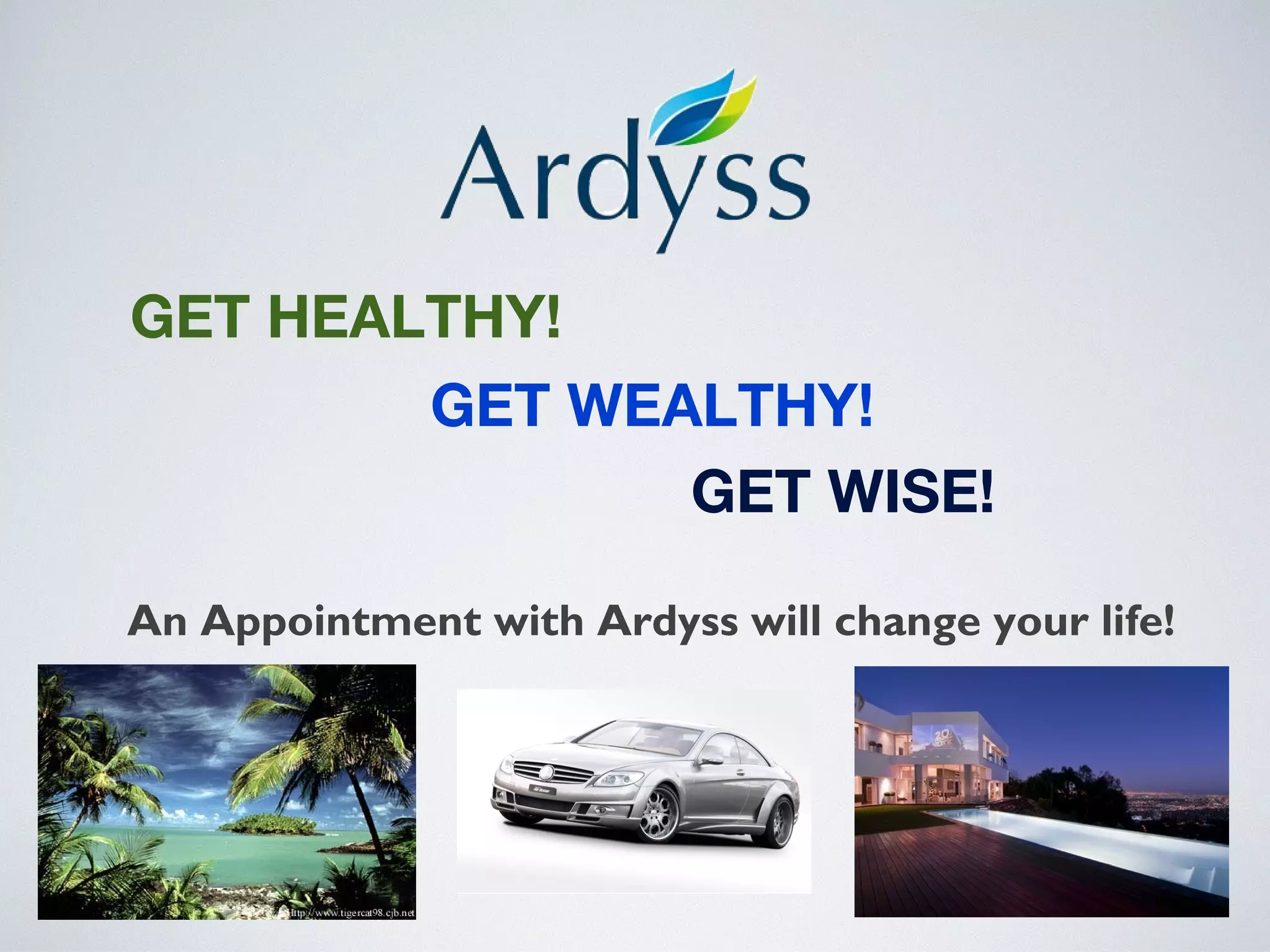 This document promotes an opportunity with Ardyss International that claims to help people achieve health, wealth, and wisdom. It suggests joining their company and selling their products could lead to weight loss, increased energy, and monthly incomes of $500-$5000 within six months. The opportunity involves their line of superfruit supplements and network marketing system for building a team. It outlines their compensation plan with various bonuses and commissions available.