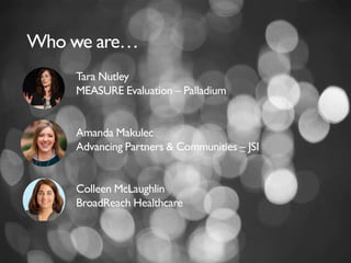The document discusses the use of data visualization tools in improving data-informed decision making for HIV programs across various regions. It highlights best practices such as collaboration with end users, ensuring data quality, and the importance of training, showcasing specific case examples from different countries. The results indicate that effective data visualization can lead to significant improvements in health outcomes by enabling more targeted interventions and resource allocation.