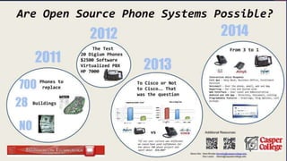 Casper College evaluated transitioning from an aging Avaya and Cisco phone system to a unified communications platform, ultimately deciding on Digium Switchvox as a cost-effective solution. The project aimed to consolidate three phone systems into one, standardize handsets, and enhance voice communication capabilities while minimizing recurring costs. The successful pilot highlighted the importance of commercial support and the right organizational culture for implementing a feature-rich VoIP system.