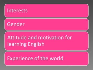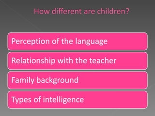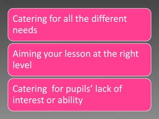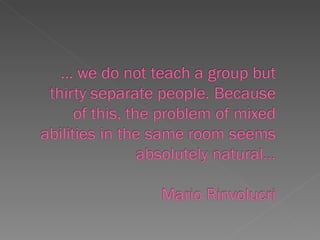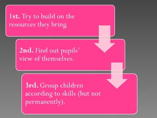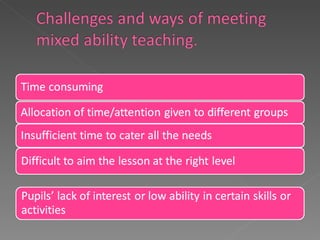 This document discusses strategies for teaching mixed-ability classes, including differentiating instruction, peer tutoring, grouping students, and having high expectations. It emphasizes treating students as individuals, teaching core content to all while providing reinforcement or extension work as needed. Partnering stronger and weaker students is presented as an option if the roles and goals of helping are made clear.