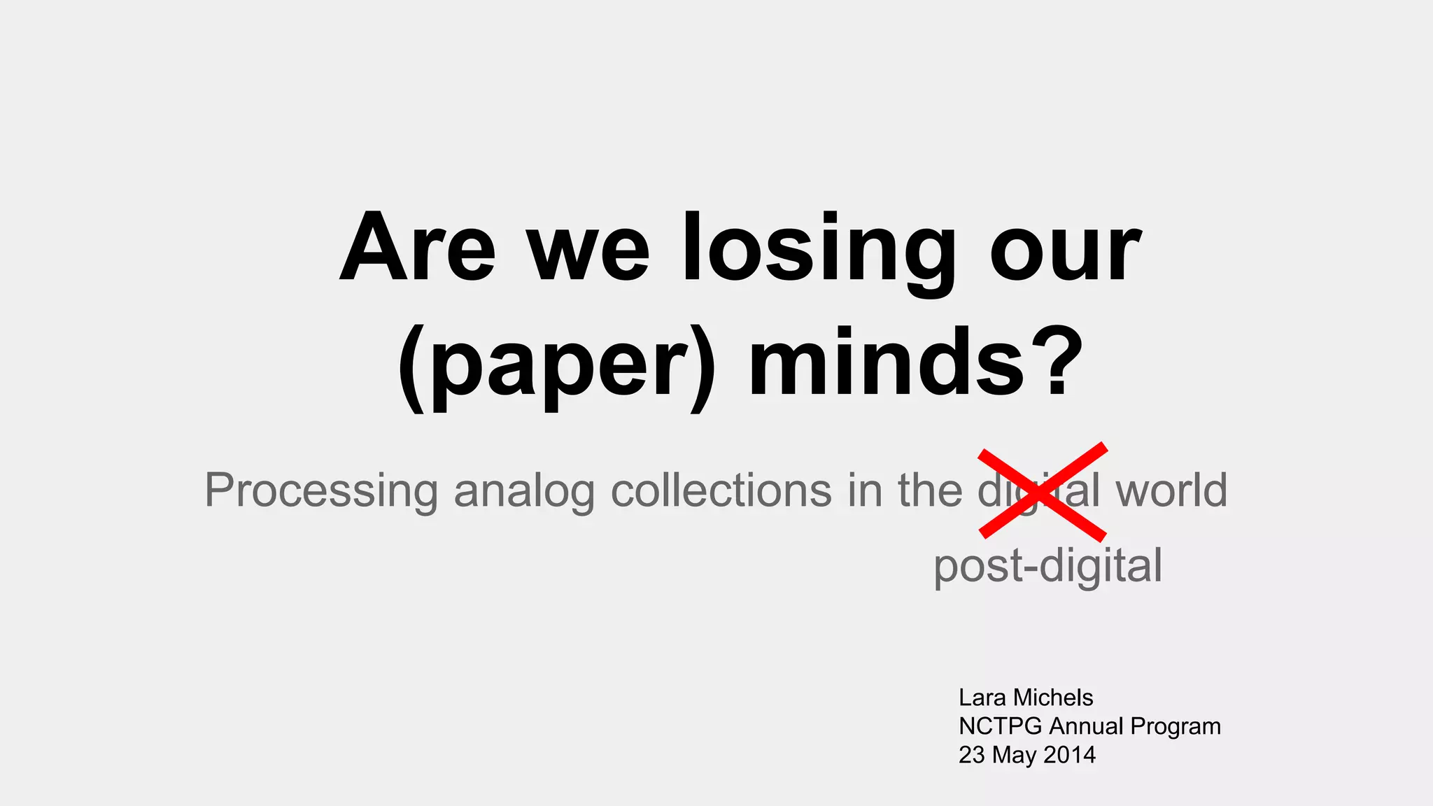 The document discusses the transition from traditional archival practices to a post-digital approach, highlighting the necessity of integrating both analog and digital technologies in a rapidly evolving media landscape. It addresses the challenges archivists face as the age of print wanes, with lingering assumptions clashing against contemporary digital practices. Contributors emphasize the importance of evaluating technologies based on merit rather than nostalgia or novelty.