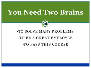 The document explores the differences between the left and right brains, emphasizing that most people predominantly use one type, either logical or creative thinking. It discusses the advantages of right-brain thinking in problem-solving and creativity, suggesting that in a world dominated by left-brained logic, right-brainers possess a competitive edge. Exercises are provided to help individuals identify their dominant brain type and encourage the development of the less dominant side.