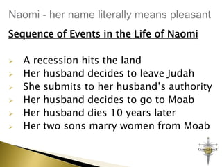 The document summarizes the story of Naomi from the book of Ruth in the Bible. It describes the sequence of events in Naomi's life: she and her family left their home during a famine and moved to Moab, where both her sons died, leaving her without any family. Feeling she had nothing left, Naomi decided to return to her homeland, but asked her daughters-in-law to stay behind. Ruth insisted on going with Naomi. When they arrived, Naomi declared her name was now "Mara," meaning "bitter," because she had left her homeland as a woman with a family but returned empty and alone. The document warns about allowing bitterness to damage relationships with God, others,