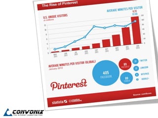 Pinterest is a visual social media platform that allows users to create, share, and organize themed image collections called boards. Founded in December 2009 and launched in March 2010, it rapidly grew to over 1.5 million users with significant engagement, making it the third most visited social media site in the U.S. The platform is particularly beneficial for e-commerce and creative industries, driving higher conversion rates compared to other social networks.